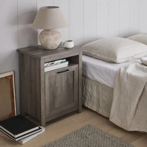 Avec ses panneaux stratifiés en décor bois gris, cette table de nuit au style contemporain et épuré saura s’intégrer parfaitement dans les chambres des enfants comme des parents. Elle vous sera aussi très pratique pour déposer livres, lunettes ou réveil sur son plateau… et bien plus si vous le souhaitez grâce à l’espace de rangement disponible dans la partie inférieure.