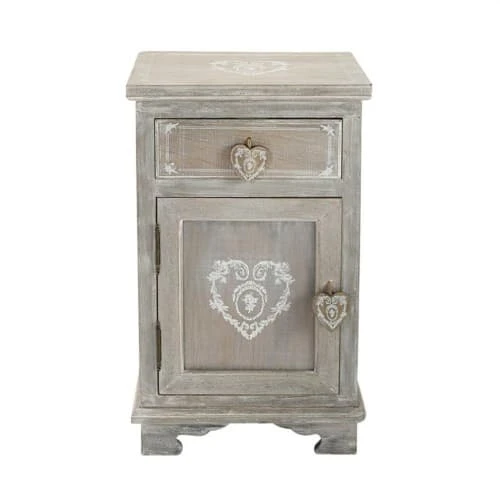 Romantique à souhait, la table de chevet CAMILLE apportera de la douceur dans votre chambre ! Sa teinte légèrement grisée avec ses poignées en forme de cœur insuffle une ambiance délicate : idéal pour venir compléter une chambre dans la tendance shabby chic ! Côté rangement, vous disposerez d’un tiroir et d’une porte pour y accueillir tous vos accessoires. Un conseil déco ? Sublimez cette table de nuit d’une lampe de chevet dans les tons pastels !