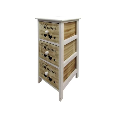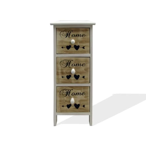o Dimensions: H 59 cm x L 26 cm x P 30 cm o Dimensions des tiroirs (3): H 14,5 cm x L 19,5 cm x P 25 cm o Couleur: Blanc, Beige, Noir